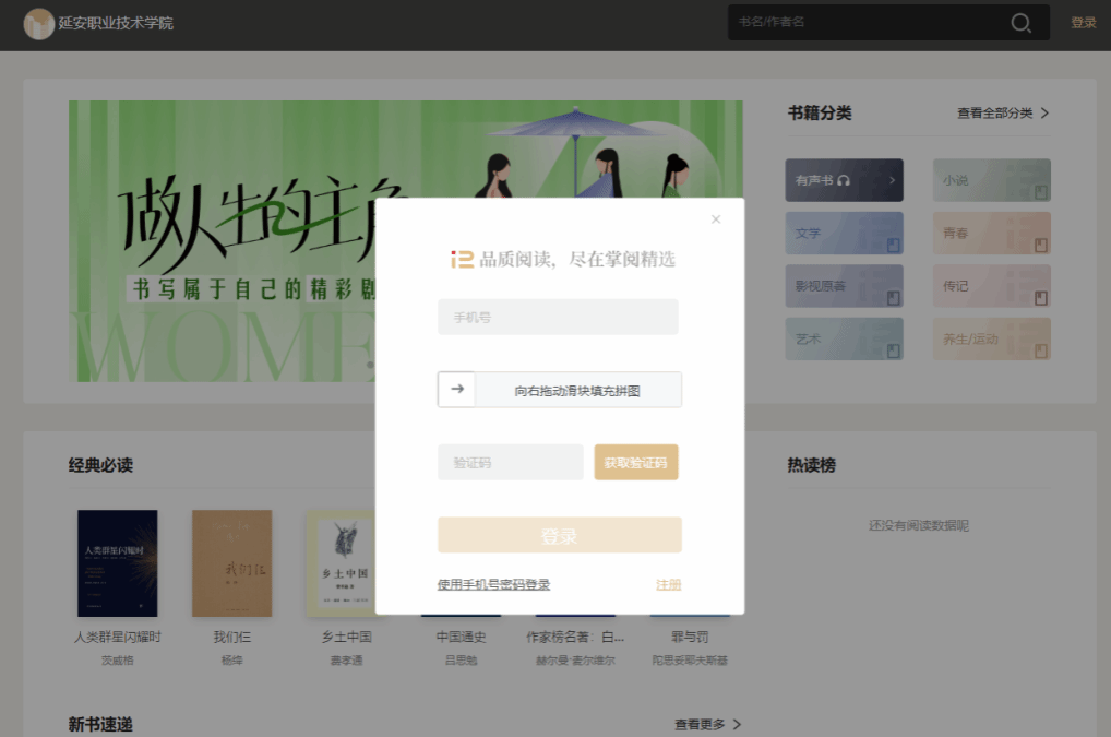 打开手机APP客户端,点击进入“延安职业技术学院图书馆”,在里面寻找喜欢书籍,下载阅读即可。